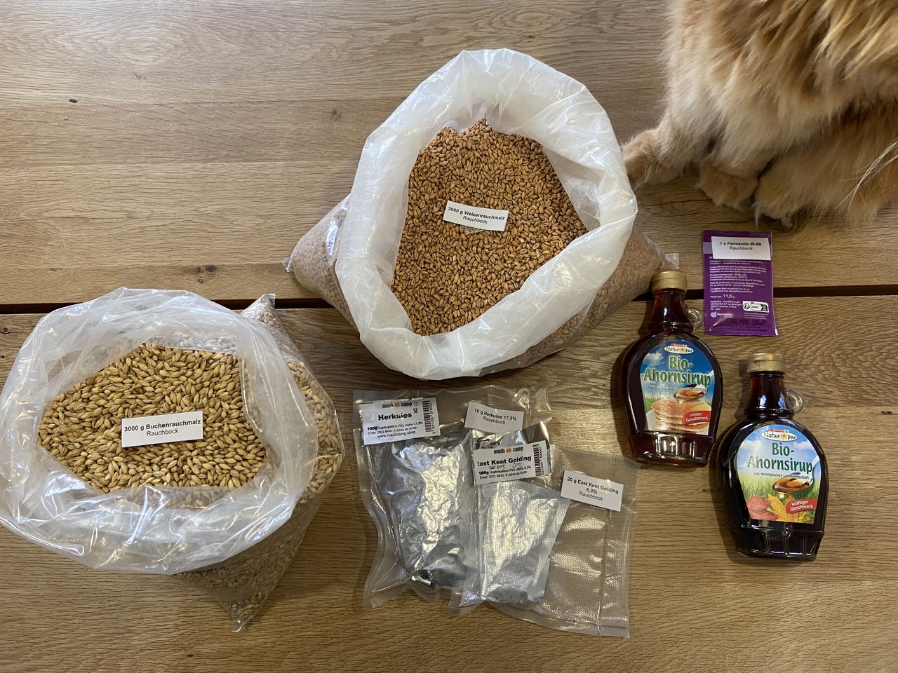Wir lieben bekanntermaßen Rauchbiere und starke Biere. Heute haben wir ein Rauchbier mit ausschließlich Rauchmalz gebraut. Vergärt wird mit einer Weizenbierhefe – der W-68 – und nicht wie bei klassichen Bockbieren mit einer untergärigen Hefe. Damit wir die Bock-Stammwürze erreichen haben wir uns als Hilfsmittel für Ahornsirup entschieden. Wir glauben, dass das eine wirklich gute Kombi werden könnte: das rauchige Speckaroma der Malze, die Banane von der Hefe und vielleicht etwas karamelliger Geschmack vom Ahornsirup.