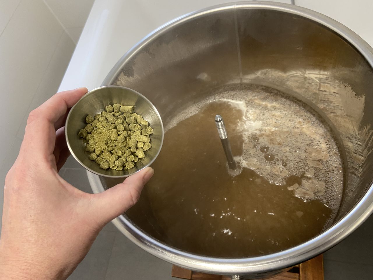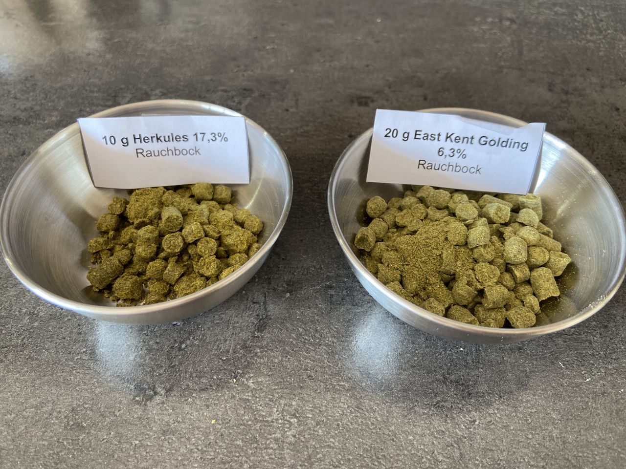Die Kochzeit beträgt 60 Minuten. 10 g Herkules kommen bei Kochbeginn rein, 20 g East Kent Golding 10 Minuten vor Kochende.