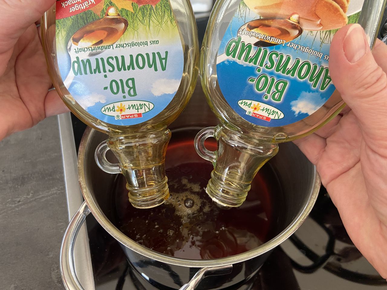 250 g Ahornsirup (mild) und 250 g Ahornsirup (kräftig) haben wir im Topf erwärmt und 10 Minuten vor Kochende dazugegeben.