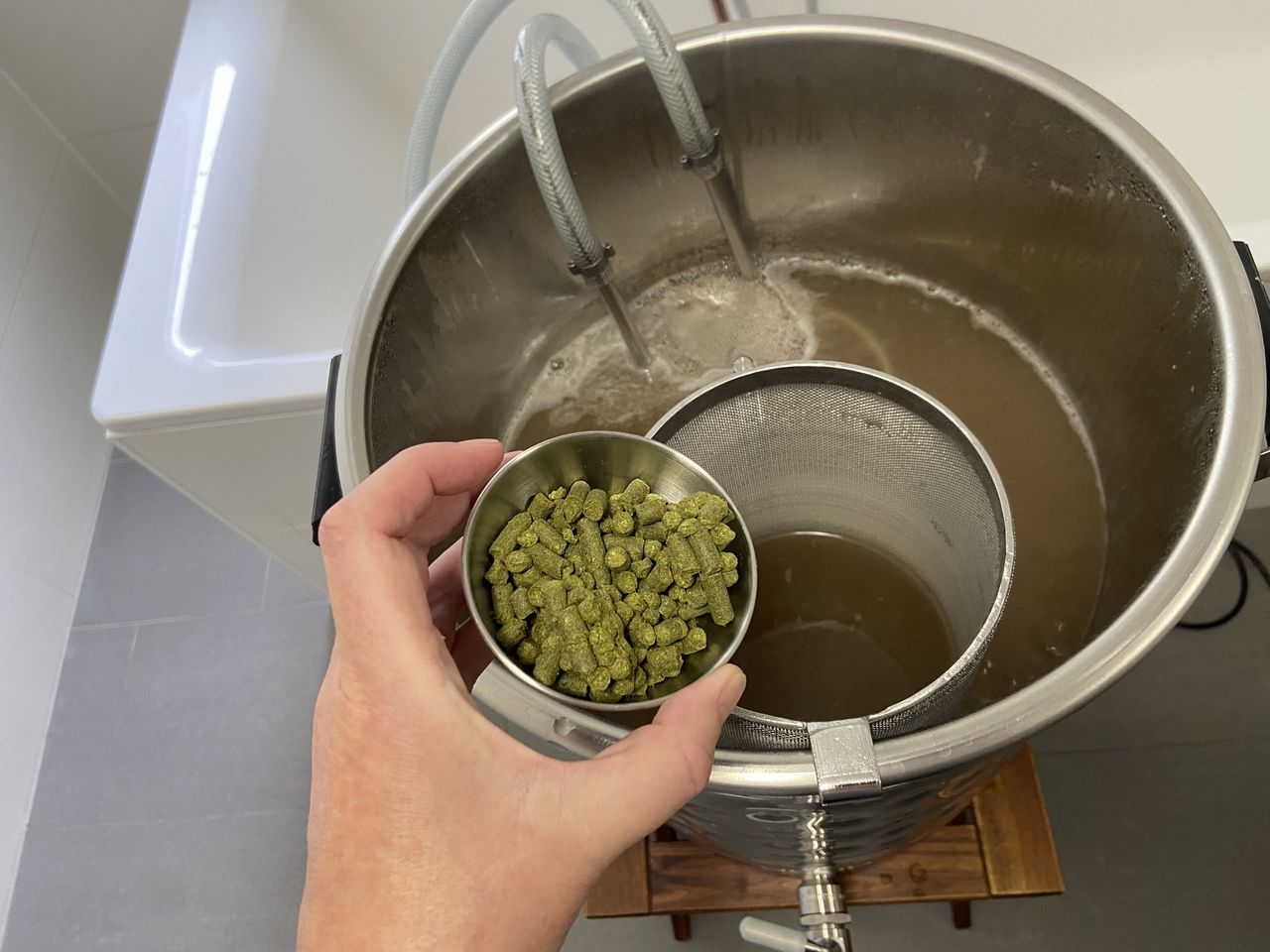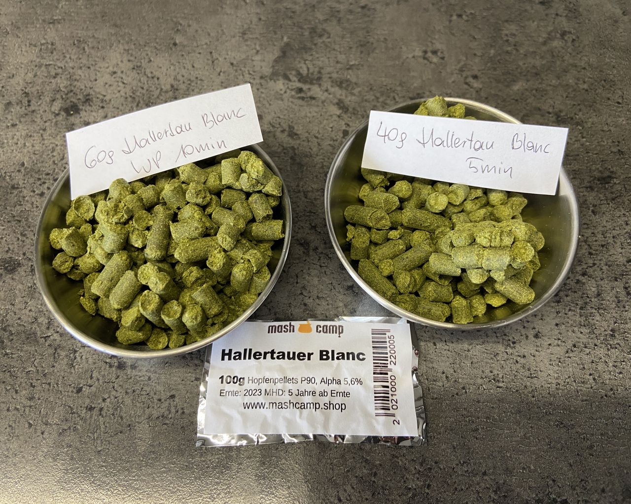 40 g Hallertau Blanc kommen 5 Minuten vor Kochende (Kochzeit 60 Minuten) in die Würze. 60 g Hallertau Blanc kommen bei 80 °C in den Whirlpool und ziehen dort für 10 Minuten bis die Kühlung wieder weitergeht.