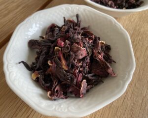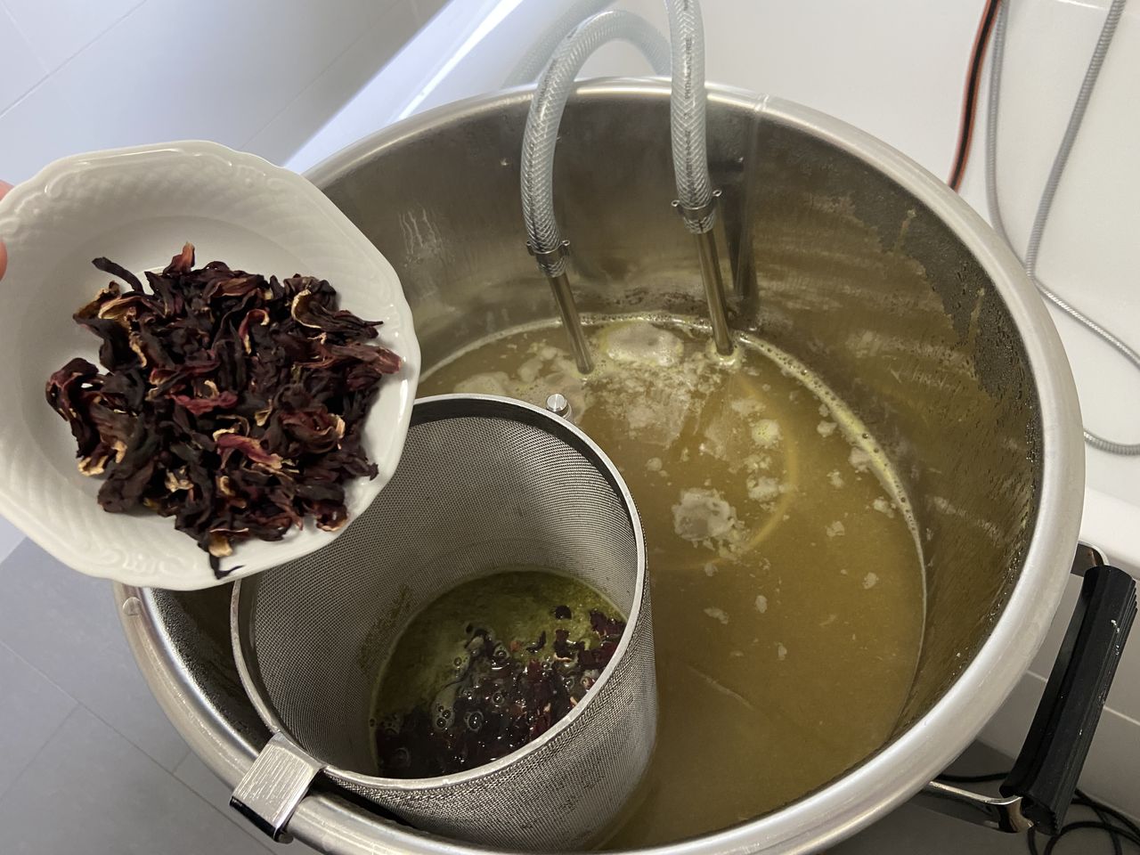 50 g getrocknete Hibiskusblüten kommen bei Kochende in den Hop Spider und bleiben bis zum Abseihen in der Würze.
