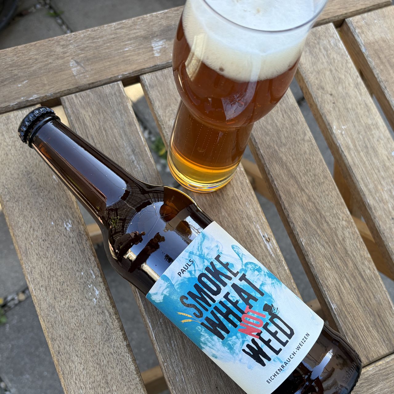 Im Vergleich zum letzten Sud ist das Bier dieses Mal weniger trüb, aber trotzdem nicht weniger schön. Wir haben dieses Mal zusätzlich zum Eichenrauch-Weizenmalz auch selbst geräuchertes Wiener Malz verwendet. Dadurch ist das Raucharoma besonders in der Nase viel deutlicher wahrnehmbar, es dominiert trotzdem die Banane.